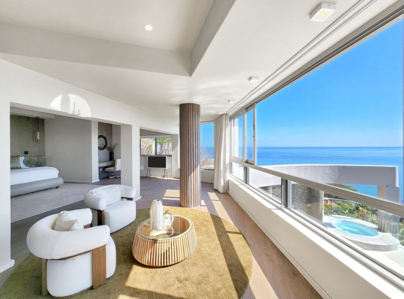 Designed for effortless indoor-outdoor living, the villa balances openness with privacy. Expansive glass doors fold back to reveal the main pool, a secondary plunge pool and a jacuzzi positioned to capture the view. Inside, clean architectural lines soften into warm living spaces and a fully equipped chef’s kitchen built for long, unhurried dinners.